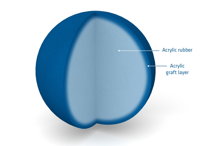 The Kane Ace™ acrylic core-shell structure consists of an acrylic rubber core, which acts to absorb and dissipate the impact energy, and an acrylic graft layer. This acrylic shell layer improves the adhesion with the polymer matrix and facilitates dispersion.