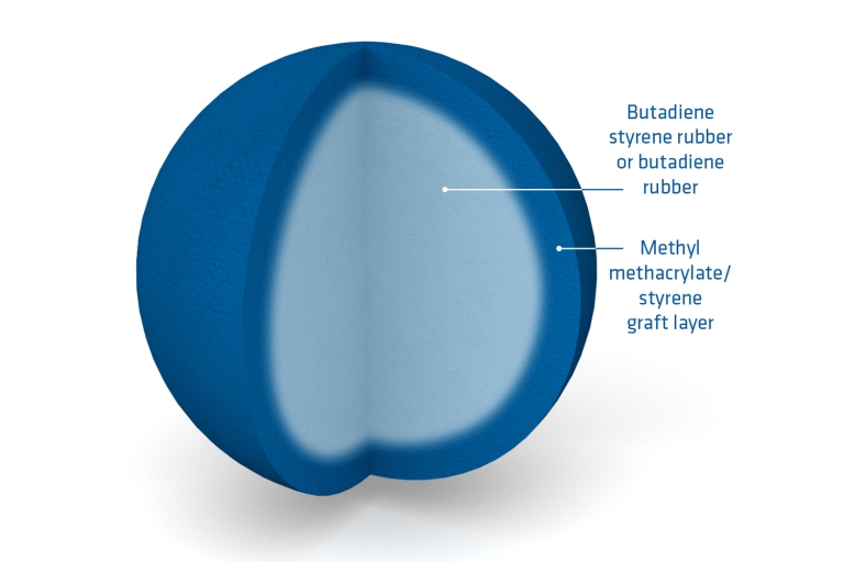 The MBS core-shell structure consists of a butadiene-based rubber core, which acts to absorb or dissipate impact energy, and a methyl methacrylate styrene graft polymer covering the core. This graft layer improves the adhesion between the polymer matrix and the impact modifier.